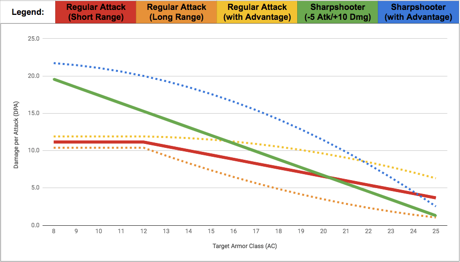 In January of 2018, I ran a poll asking D&D players about feat strength. Nearly 60% felt that the Sharpshooter feat is "broken": Are they right? If so, when? Nobody is always right--except the Dungeon Master. To find out, I built a calculator to determine the benchmarks where Sharpshooter is advantageous to use. Introducing "The … Continue reading How Strong Is Sharpshooter?