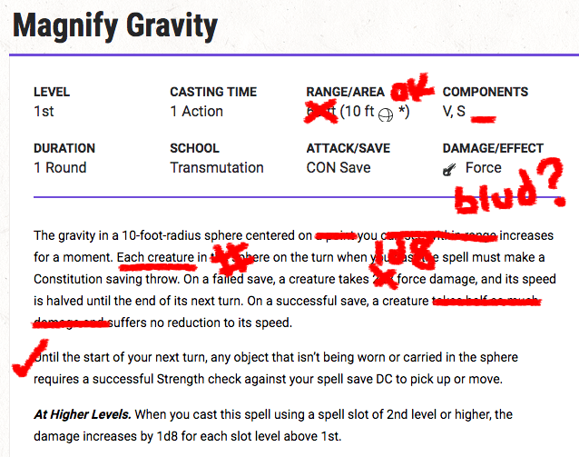 I was checking out the new Explorer's Guide to Wildemount when I came across an absolute gem: Magnify Gravity. This spell is awesome! Super flavorful, must-take spell. Anytime I start thinking "must take" a red flag goes up. Let's check out the balance and see what knobs we can turn to tune it.
