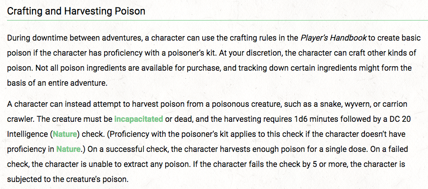 Harvesting. If you’ve felled the right monster (there’s 4 listed), you can make a DC 20 Intelligence (Nature) check to harvest their poison. If you have the Poisoner’s Kit, you can use that instead, but you don’t get to stack it with your Nature bonus. Without more, a Poisoner’s Kit is a tough sell for a proficiency investment vs. a skill with broader application.