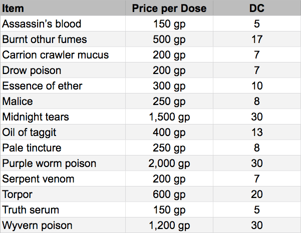 We’re not lost. The PHB guidelines use cost as a reference. We can balance on the same principles. If we divide all the costs by 30, we get a reasonable DC spread that allows players to reliably create poisons at lower levels. Here’s our DCs: