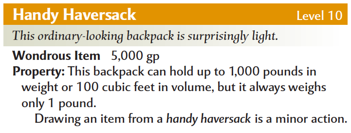 Since Heward’s Handy Haversack has separate pockets on the side, you can get creative with implementation. A slight upgrade would permit bonus action access to the side pockets, while the main pocket remains action access (like the Bag of Holding). A stronger upgrade would allow access to the main pack as a bonus action, with side pocket access as an object interaction. Parsing things like equipment storage location can often be more headache than it’s worth, so consider whether this amount of fiddlyness fits your campaign.