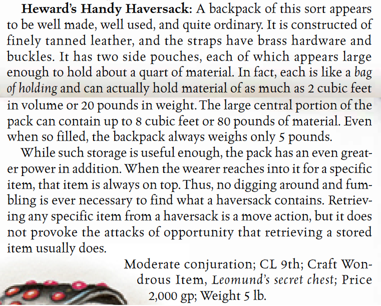 “When you reach into the haversack for a specific item, the item is always magically on top.”