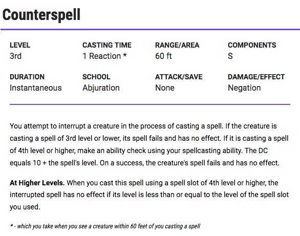 Like our last discussion about Cutting Words, this doesn’t really mesh with the way we play the game. Typically, a DM or player announces that a character is casting the spell by naming the spell. If a DM or player announces their spell while the opposing side holds a counterspell, they’re technically putting themselves at an informational disadvantage.