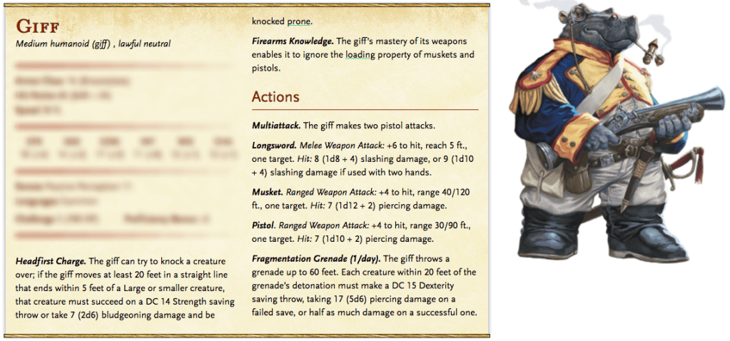 It’s not just flavor text–MTF’s mechanics enforce Giff’s cultural association with modern warfare. They have a musket and a pistol, supplemented by a 1/day grenade. Giff features drive this further, allowing them to ignore weapon loading due to firearms knowledge, and granting multiattack for their pistol (but not longsword).