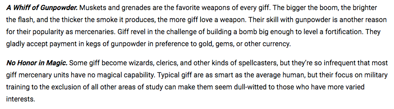 So gun-toting Giff are fine as a racial concept, even if they are toting heavy crossbows and alchemical eggs in my world. (Actually, in my world, they might be voluntarily indentured to the dwarves of the Blackrock Clan, the only makers of gunpowder and explosives outside of magical traps.)