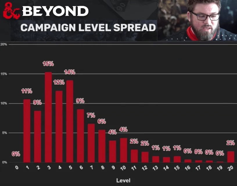 D&D’s April 2015 Player Survey data suggested “most of you are still playing in the 1st to 6th level range.” Notably, that survey was only a month after the game officially released. Folks also cite DnDBeyond’s Campaign Level Spread data, which controlled for certain factors in an attempt to only capture played characters, but remains imperfect and suffers from sampling bias. Sometimes, folks point to the sales data of third-party content produced for Adventurer’s League and DM’s Guild, which still composes a small fraction of the player base.