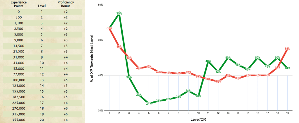 Stunted character development can sap player excitement and kill campaigns. While only a factor for tables using XP, this “XP valley” may contribute to D&D’s perceived low level focus. Perhaps D&D’s recent emphasis on milestone leveling is an attempt to address this issue with level progression. Even so, an adjustment to the experience progression tables could alleviate this pain point for parties using XP.