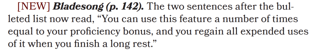 One of the tweaks to this class was the number of uses you get for Bladesong, the subclass’s eponymous feature. Originally printed to permit two uses per (short) rest, the feature has received errata to scale off proficiency bonus.