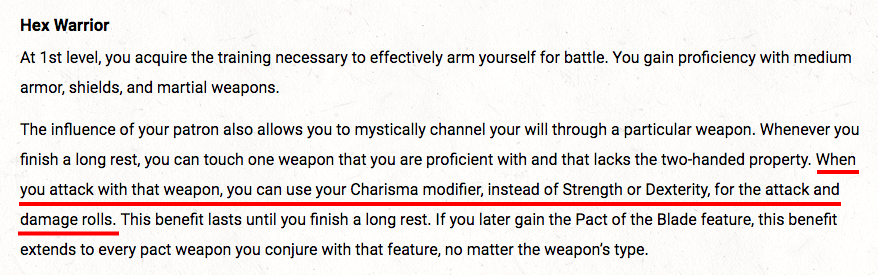 Hexblade really took it to the next level. When it was released in Xanathar’s Guide to Everything, the Hexblade enabled Warlocks to use their Charisma (CHA) modifier for attacks and damage. Since this works with your bonded weapon, it scales when you find a magic weapon that has a +1/2/3.