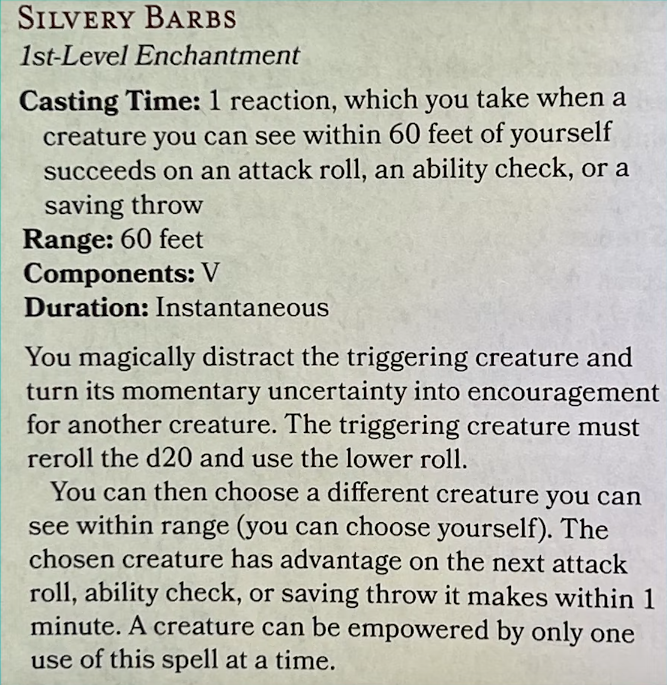 Although it’s a 2nd level spell, Fortune’s Favor is an interesting comparison because the effects are similar to Silvery Barbs. The primary effect is dice manipulation.