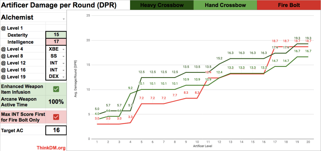 Examining damage outputs of cantrips vs. crossbows for the new Unearthed Arcana Artificer. It seems crossbows can outscale cantrips, but at what cost?